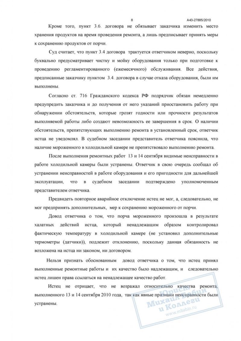 Дело показывает, что при доказанной некачественности работ исполнитель несёт ответственность за все прямые убытки заказчика, включая стоимость испорченного товара. Ключевым фактором успеха стало системное документирование недостатков, фиксация причинно-следственной связи и своевременное проведение экспертизы. Кейс также подчёркивает, что ссылки исполнителя на отсутствие его вины не принимаются судом, если доказательства подтверждают обратное.