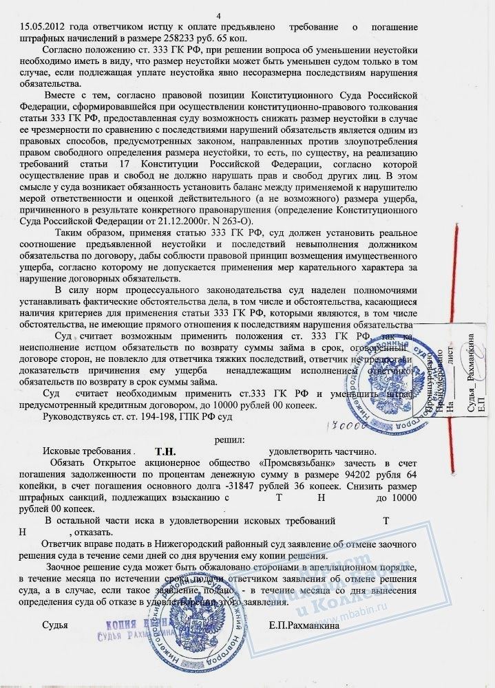 01.10.2012 гражданка Т.Н., интересы которой представляли сотрудники нашей компании, обратилась в суд с иском к ОАО «Промсвязьбанк».