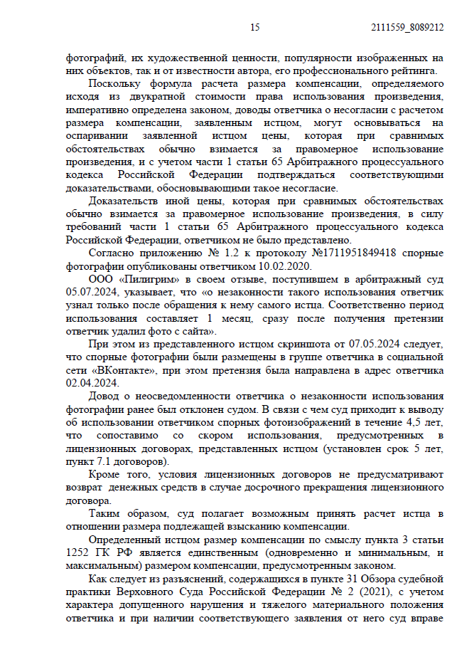 - Ответчик заявил, что узнал о нарушении только из нашей претензии и сразу удалил фото. По их версии, период незаконного использования составил всего 1 месяц.