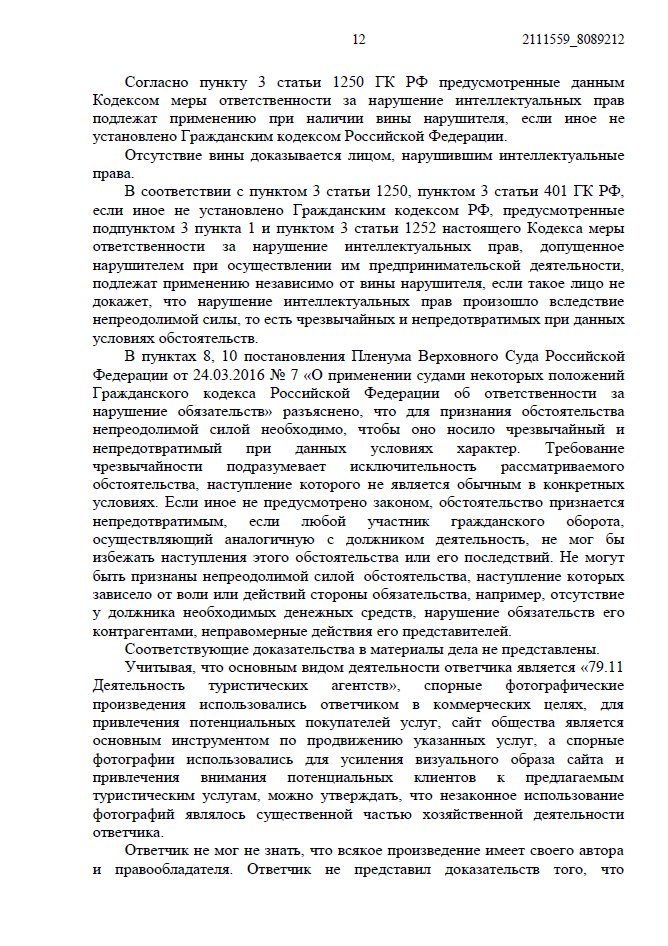 - Коммерческое использование наказуемо строже. Суд подчеркнул: так как ответчик — турагентство, фото использовались для извлечения прибыли и усиления привлекательности услуг. Это существенная часть бизнеса, что исключает снижение компенсации.